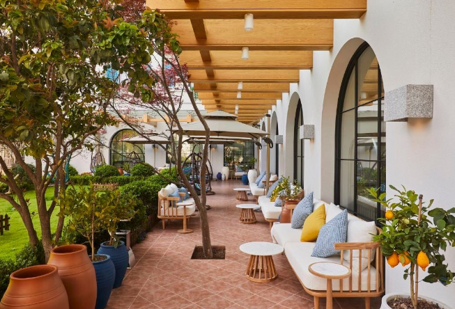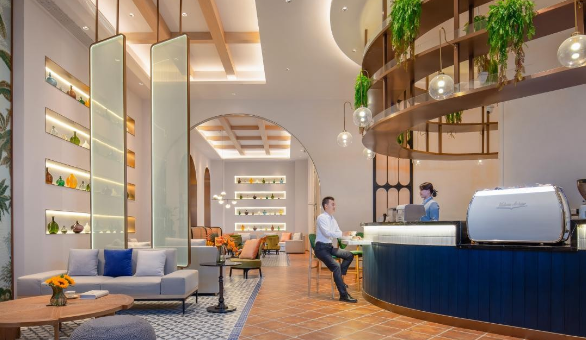 欧暇·地中海酒店通过复刻地中海自然与建筑平衡的设计,融入地中海特色的健康美食等细致服务,打造了地中海式休闲度假场景体验。例如酒店采用了肌理漆、文化石、原木雕等材料,植入了地中海生活场景中的陶罐、琉璃瓶、藤编和橄榄等元素,配合柔和明亮的色调风格,营造出独特的地中海休闲度假体验。这种多维度的设计风格使欧暇·地中海酒店在众多酒店中脱颖而出,给顾客留下深刻的印象。